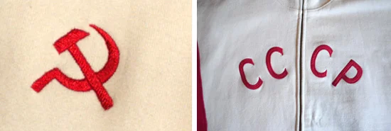 Básicamente, la chaqueta es blanca con los siguientes dos distintivos: por una parte, las letras CCCP (Unión de Repúblicas Socialistas Soviéticas, Souyz Sovietskich Socialisticheskich Respublic en alfabeto cirílico) en rojo en la parte frontal, y la hoz y el martillo bordado en el lateral.