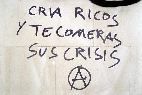 Claro que a nosotros los españoles nos queda la estúpida, pero muy frecuentemente mencionada, satisfacción patriótica de que el banco Santander está comprando a precio de ganga medio mundo financiero, y el consuelo de que tenemos un sector financiero saneado, y si los bancos van bien, entonces todo debería ir bien. Desgraciadamente, de lo primero no siempre se deriva lo segundo. Un aspecto interesante de esta crisis, y que ha sido uno de los principales mecanismos utilizados por el sector financiero, es la aplicación constante de una efectiva política del miedo, por la que se ha allanado el camino de las ayudas estatales; la sociedad ha acabado creyendo, por miedo a unas consecuencias que nadie conoce, que no se puede dejar caer a la banca. Como bien indicaba El Jueves, los ricos son ahora los nuevos terroristas.