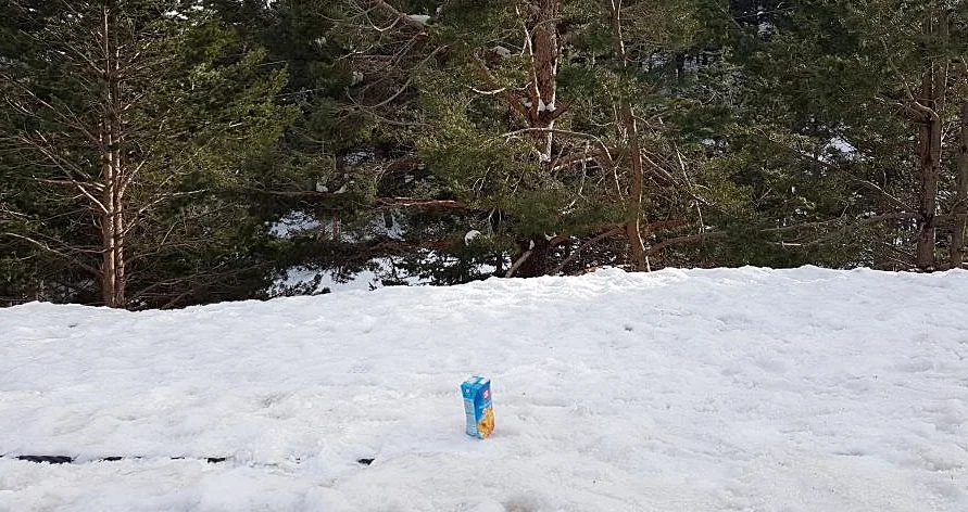 Eso no fue todo. En el aparcamiento varios embalajes de plástico y alguna bolsa campaban a sus anchas y al llegar al coche, algún simpático hijo de puta había dejado un tetrabrik de zumo sobre la nieve que delimitaba el aparcamiento, tal y como aparece en la foto. Probablemente le pareció divertido o no daba para más, nunca lo sabremos. Aunque en este caso no había un ser humano en el que concentrar mi odio acumulado, como no quiero que nadie me acuse de discriminación, también a todos ellos les deseo la peor de las agonías. Mi nivel de odio hacia el incivismo y la maldad humana es cada día mayor. Hasta que se haga insoportable, seguiremos aguantando. Entonces ya veremos.