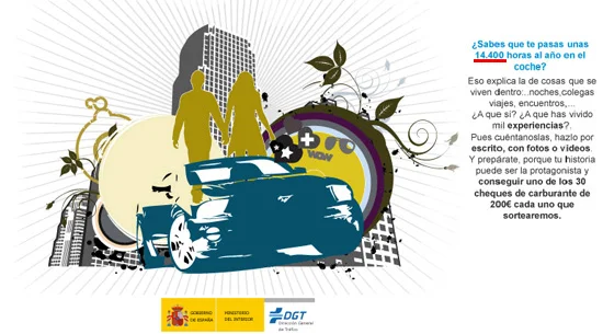 No sé si han visto la nueva campaña de la DGT, «En el coche puedes vivirlo todo o perderlo todo». Ese es un detalle de su página en Internet. El problema, si se fijan, es que para pasar 14400 horas al año en el coche, el día tendría que tener casi 40 horas, y nosotros pasar todo ese largo día dentro del coche, lo que seguramente es probablemente algo desesperante. La captura de pantalla, donde se ve lo mismo algo más nítido, aquí.